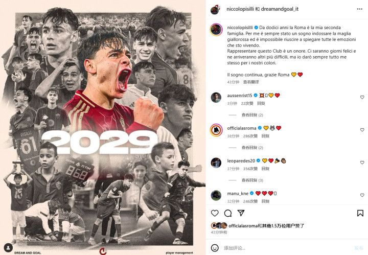 在续约官宣后皮西利更新了社媒,晒出自己续约成功的海报,并配文写道:“这12年来,罗马一直是我第二个家,穿上罗马球衣一直是我的梦想,现在我激动的心情难以言述。能够代表罗马出战,我感到非常荣幸,虽然一路走来有欢笑,也有苦涩,但我会为了球队付出所有。梦想仍在继续,谢谢你,罗马。”